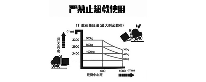 注意:寬支腿型半電動(dòng)堆高車,須按照堆高車的載荷曲線圖鎖允許的剩余載荷進(jìn)行操作(如下圖),嚴(yán)禁超載使用,確保安全.
